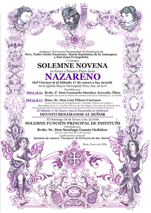 ROTA COFRADE.- Desde el próximo viernes, 9 al sábado 17 de enero a las 19:00 horas, se desarrollará la solemne novena en honor a Ntro. Padre Jesús Nazareno, en la Parroquia de Ntra. Sra. de la O, que será oficiada por el Rvdo. P. D. Leonardo Sánchez Acevedo (Pbro. y Delegado Diocesano de Medio de Comunicación de la Archidiócesis de Sevilla) y el Ilmo. Sr. D. Luis Piñero Carrasco (Delegado Episcopal de Evangelización, Canónigo Prefecto de Liturgia y Mayordomo de la Santa Iglesia Catedral de Jerez, Párroco de San Miguel y San Juan de Ávila de Jerez).