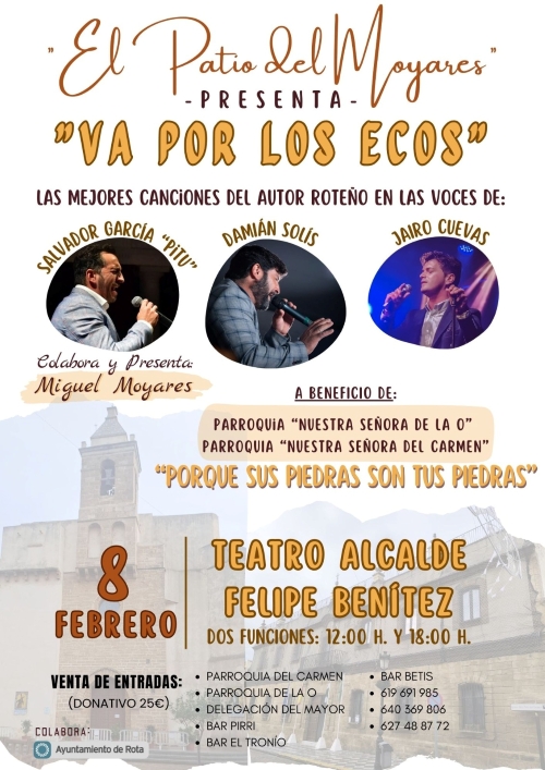 ROTA COFRADE.- El próximo domingo 8 de febrero, en el Teatro Alcalde Felipe Benítez, a las 12:00 horas y a las 18:00 horas, tendrá lugar el concierto 'Va por los Ecos' con las mejores canciones de Miguel Moyares en las voces de Salvador García 'Pitu', Damián Solís y Jairo Cuevas, siendo presentado por Miguel Moyares.