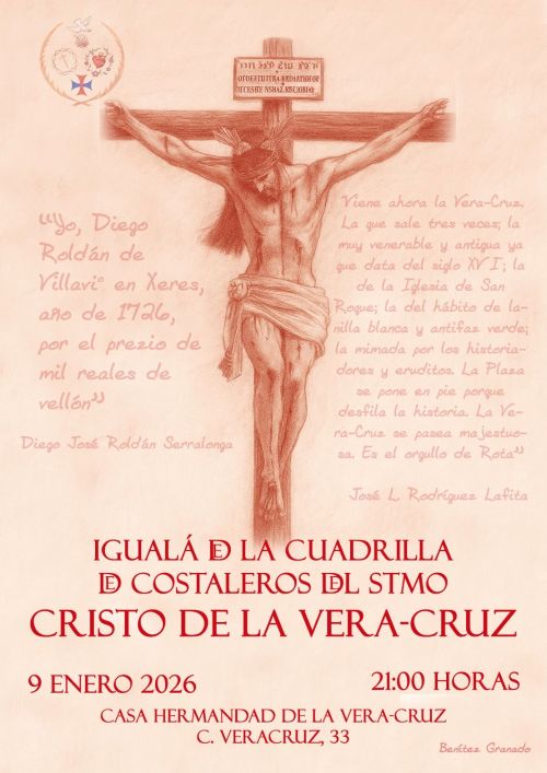 ROTA COFRADE.- La Hermandad de la Vera-Cruz ha anunciado la igualá de la cuadrilla de costaleros del Santísimo Cristo de la Vera-Cruz, para el próximo viernes 9 de enero, a las 21:00 horas, en la Casa de Hermandad de la Vera-Cruz (Calle Veracruz, 33).