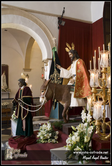 La Capilla Musical estuvo a cargo del Orfeón ‘Virgen de la Escalera’. Por motivos meteorológicos, la imagen no pudo ser trasladada en procesión de alabanza a la Capilla de San Roque, permaneciendo en la nave central de la Parroquia Mayor durante toda la jornada dominical. Las imágenes de Jesús de la Paz y la borriquita están realizadas en madera de cedro policromada. El Señor mide 1,80 metros y es imagen de cuerpo entero, con brazos articulados, destacando la expresión sonriente de Jesucristo. La borriquita, realizada a tamaño natural, está inspirada en una de raza árabe llamada ‘Carmen’ propiedad de Vicente Pate, a la que el escultor realizó un amplio seguimiento para conseguir en la talla la máxima realidad de su anatomía y movimiento.