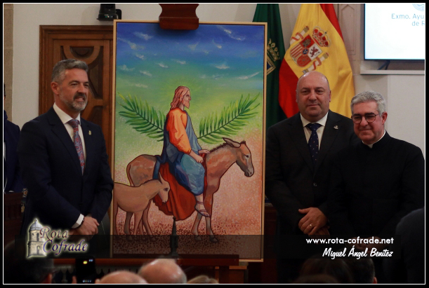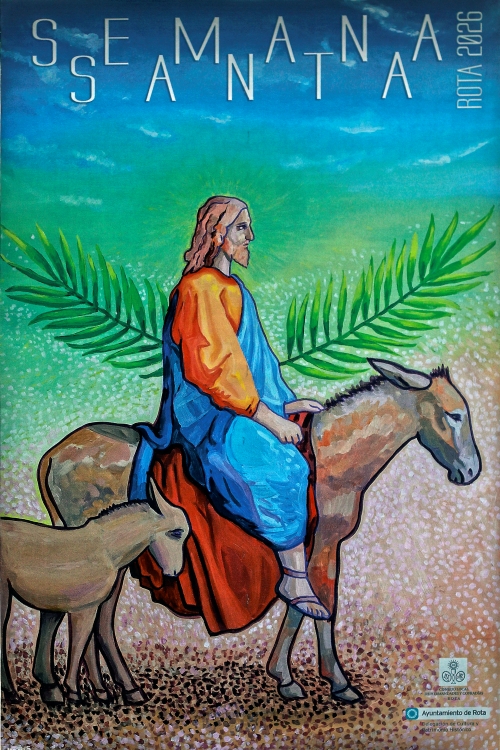 La Entrada Triunfante de Jesucristo en Jerusalén ha presentado una pintura, acrílico sobre lienzo, donde destaca su gran colorido que se aleja del realismo fotográfico. La figura de Jesucristo es el eje central, mostrándose de perfil, con una expresión serena y humilde. Destaca la presencia del pequeño pollino al lado de la burra, una referencia fiel a los Evangelios. Dos palmas cruzadas se muestran tras la figura de Jesús que simbolizan el triunfo y la aclamación del pueblo y se convierte en una especie de aureola que enmarca al Señor. Es un cartel que equilibra la tradición iconográfica con un diseño vanguardista, que rompe con lo esperado de una forma valiente, que transmite la alegría del Domingo de Ramos y la luz de Rota.