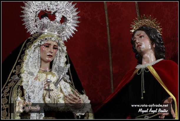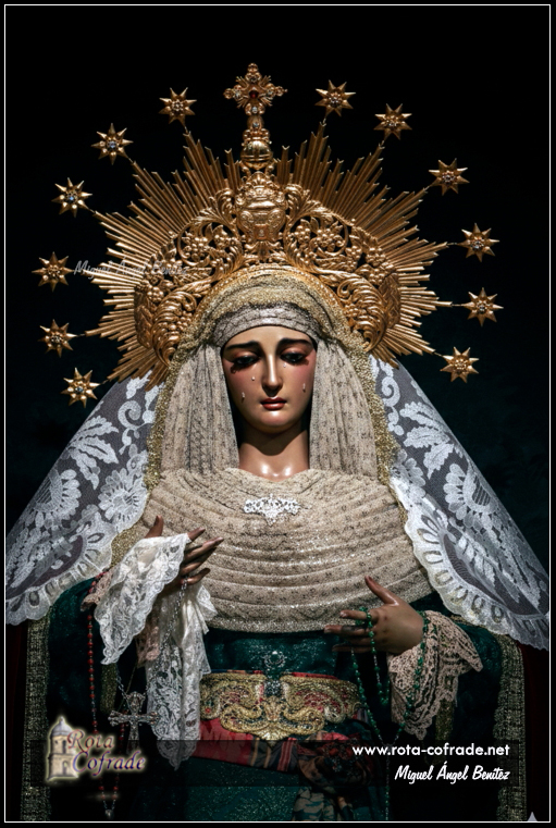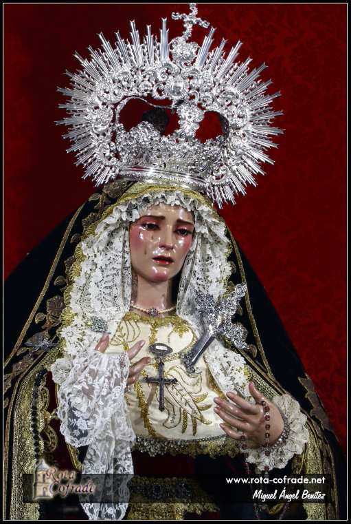 ROTA COFRADE.- María Santísima de la Amargura se encuentra vestida con saya burdeos bordada en oro, manto negro con bordados en oro procedentes de reposteros y pasamaneria antigua dorada. Su tocado está realizado con blonda de antiguo encaje de técnica mixta de duquesa y punto de aguja; el pecherín está realizado con una antigua pieza de raso de seda bordado en hojilla de oro y, en su mano porta pañuelo de encaje de Bruselas, rosario de plata y cuentas de amatistas, rosario de plata y azabache.