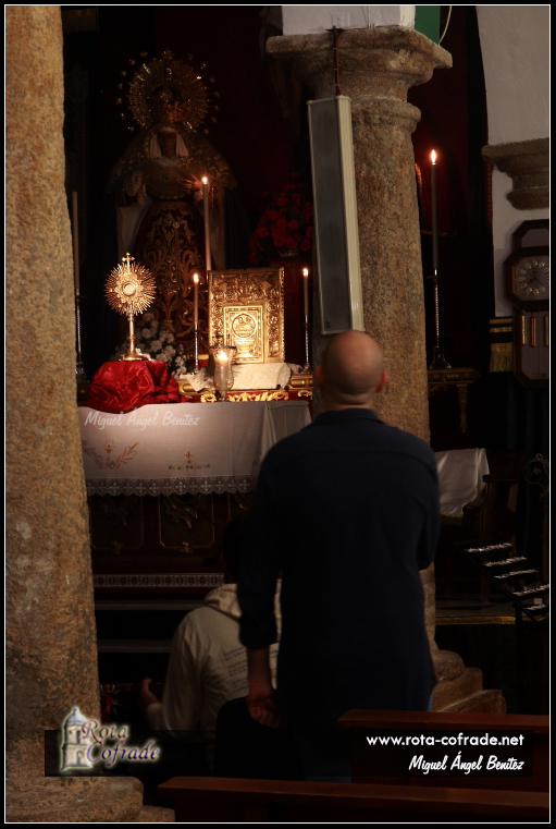 Esta práctica se inició en el año 1751 cuando, debido a una grave epidemia que asolaba a nuestro pueblo, el Mayordomo de la Hermandad Bartolomé Sánchez Manrique acordó limitar la festividad de aquel año a la estrictamente litúrgica dentro del templo, suprimiendo incluso la salida procesional de la Virgen y dando a los cultos un carácter meramente penitencial y de rogativas. Sin embargo, los cofrades de la Hermandad la noche anterior a la salida procesional acordaron el sacar a las puertas del templo la imagen de la Patrona y, ante ella, rezar los quince misterios del rosario “implorando la clemencia e intercesión de la Señora para que desapareciese cuanto antes aquella terrible calamidad”, lo que ocurrió el 2 de octubre de 1751. Según cuentas las crónicas, pocos días después la epidemia comenzó a desaparecer, no habiendo ni un solo enfermo el día 12 de noviembre.