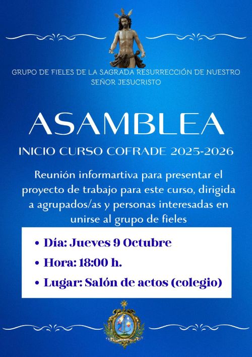 ROTA COFRADE.- El Grupo de Fieles de la Sagrada Resurrección de Nuestro Señor Jesucristo celebrará una reunión informativa de cara al nuevo curso cofrade 2025 - 2026, el próximo jueves 9 de octubre, a las 18:00 horas, en el salón de actos del Colegio Ntra. Sra. del Perpetuo Socorro (Salesianas).