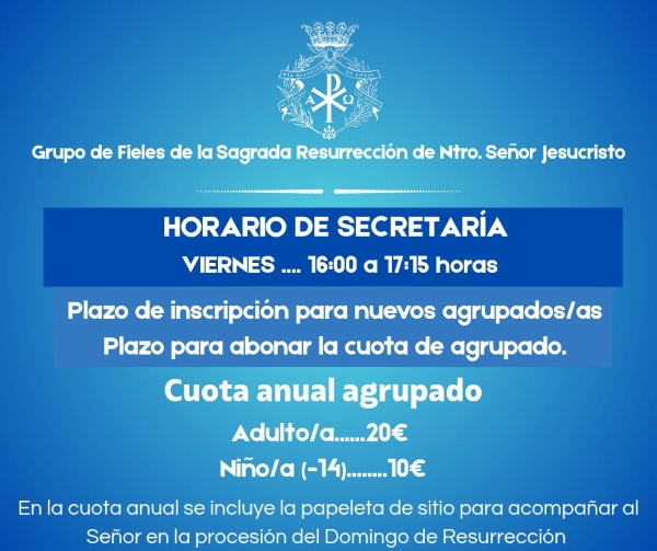 ROTA COFRADE.- El Grupo de Fieles de la Sagrada Resurreción de Nuestro Señor Jesucristo informa que el horario de secretaría será los viernes de 16:00 a 17:15 horas.
