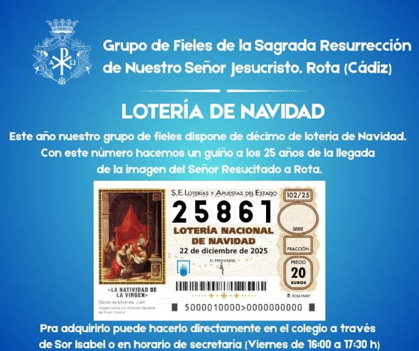 ROTA COFRADE.- El Grupo de Fieles de la Sagrada Resurrección de Ntro. Señor Jesucristo ha anunciado que dispone de décimos de Lotería de Navidad con el número 25.861.