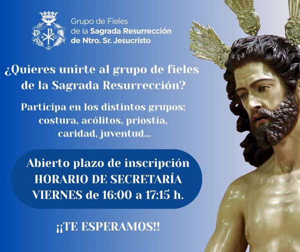 ROTA COFRADE.- El Grupo de Fieles de la Sagrada Resurrección de Nuestro Señor Jesucristo ha abierto el plazo de inscripción para aquellos que deseen unirse al grupo de fieles de la Sagrada Resurrección, participando en distintos grupos: costura, acólitos, priostía, caridad, juventud, etc.