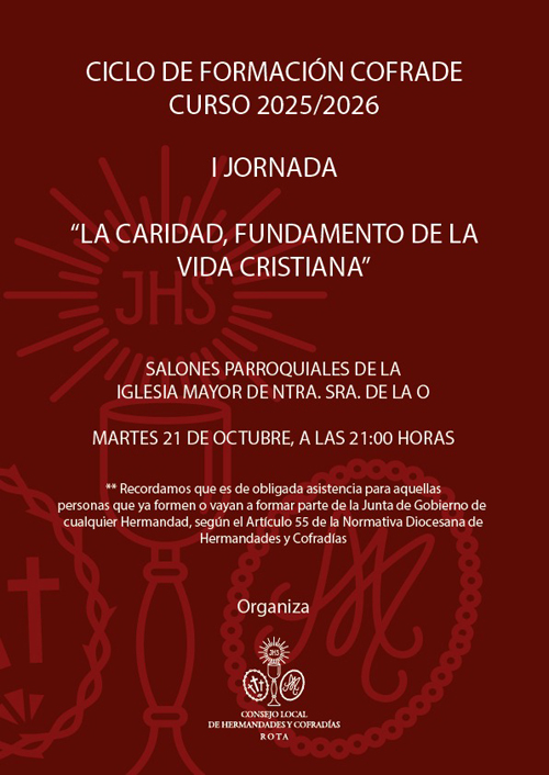 ROTA COFRADE.- El Consejo Local de Hermandades y Cofradías de la Villa de Rota ha informado de la celebración de la primera jornada del ciclo de formación cofrade del curso 2025 / 2026 y que lleva por título ‘La Caridad, fundamento de la vida cristiana’. La misma tendrá lugar en los salones parroquiales de la Parroquia de Ntra. Sra. de la O, el próximo martes 21 de octubre, a las 21:00 horas.