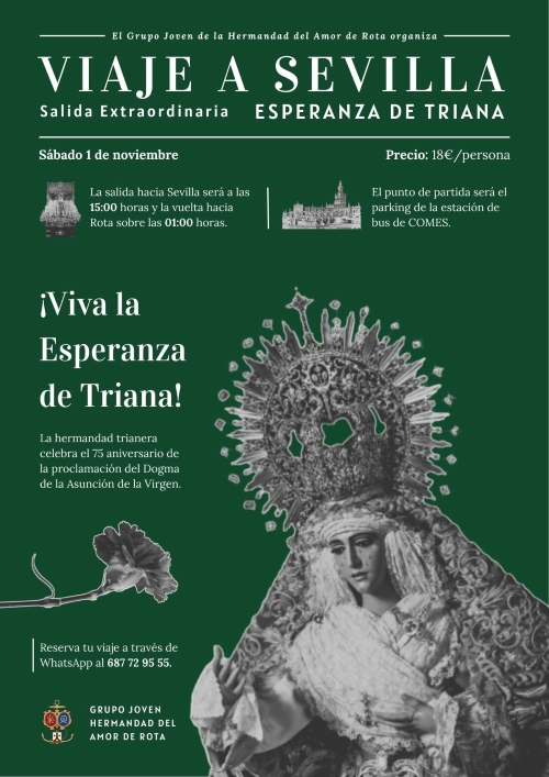 ROTA COFRADE.- El Grupo Joven de la Hermandad del Amor ha organizado un viaje a Sevilla con motivo de la salida extraordinaria de la Esperanza de Triana, que tendrá lugar el próximo sábado 1 de noviembre,