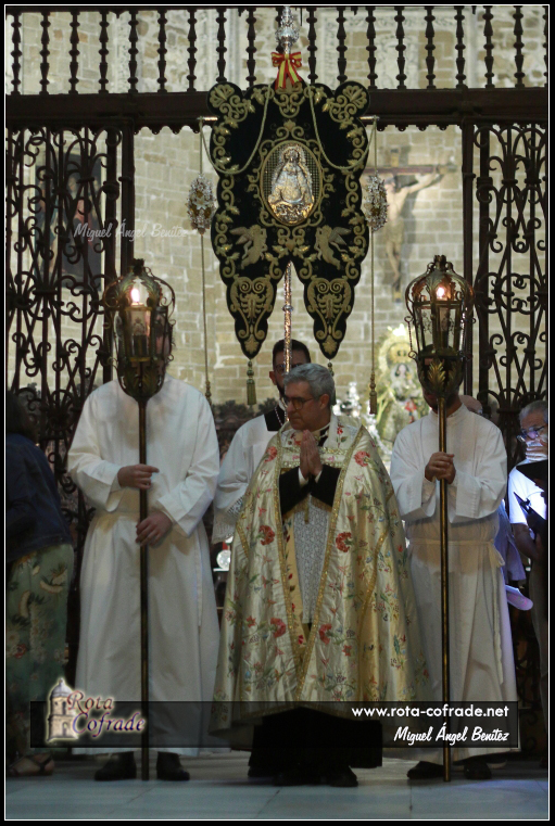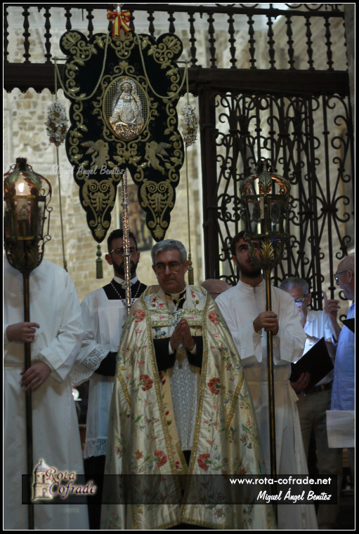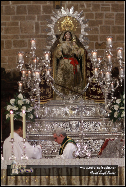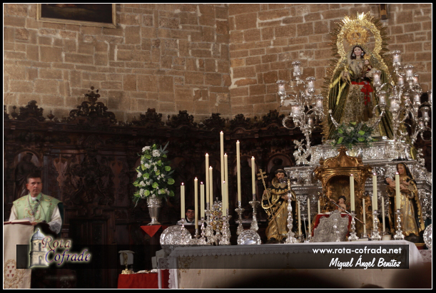 Tras el manto de la Virgen, se situaba el Rvdo. Sr. D. Pedro Javier Carrasco (Párroco de Ntra. Sra. del Carmen y encargado de predicar la Novena de la Santísima Virgen) y acompañado de acólitos.