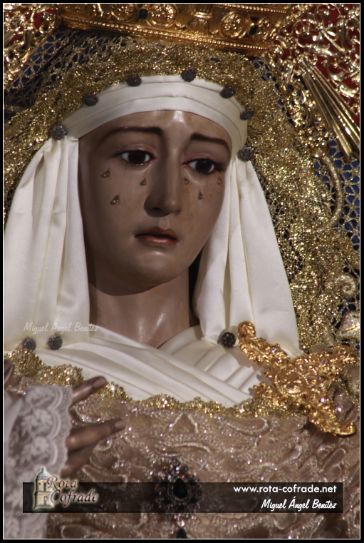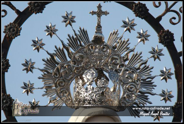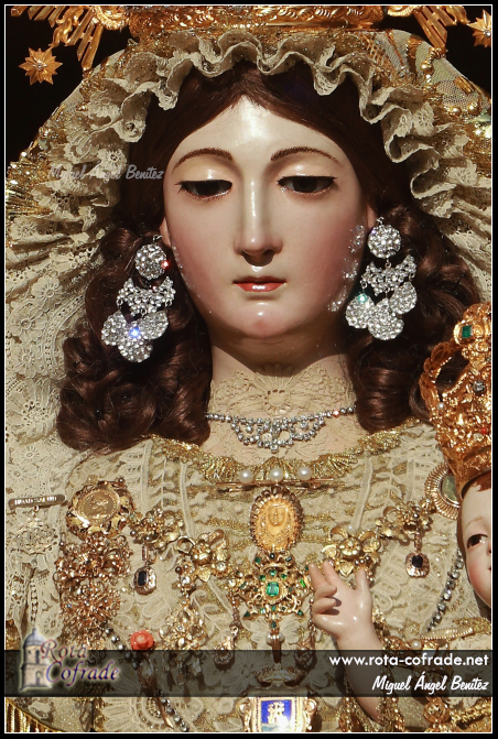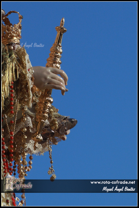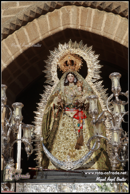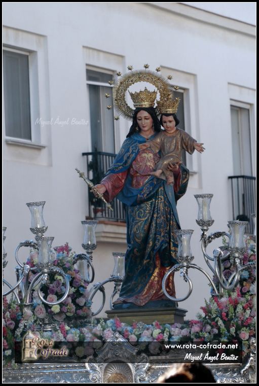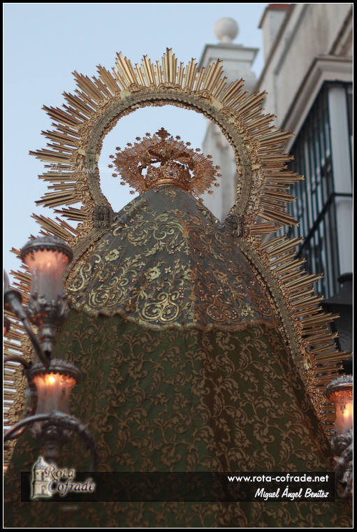 La Virgen iba escoltada por la Guardia Civil y procesionaba en el paso de plata que fue realizado por Juan Borrero con diseños de Guzmán Bejarano y que estrenó en el año de 1998 y, que en esta ocasión, iba exornado por nardos y helechos. La Virgen vestía saya de tisú bordada en oro y enriquecida con el traje de luces del torero Paco Camino; manto de brocatel a realce verde y oro; tocado de encaje de punto de aguja; cuello de encaje de Bruselas; puñetas de encaje de bolillo de oro fino y encajes duquesa. La Virgen estrenaba toca de sobremanto bordada en hojilla de oro donada por María de la Concepción González Núñez y realizada por Jesús Castizo Ramírez, que fue bendecida el pasado 2 de octubre. Por su parte, el Niño iba vestido con traje de tisú bordado en oro. Además, el conjunto escultórico lucía una ráfaga que ha sido restaurada y que fue labrada por Manuel Seco Velasco en 1960.