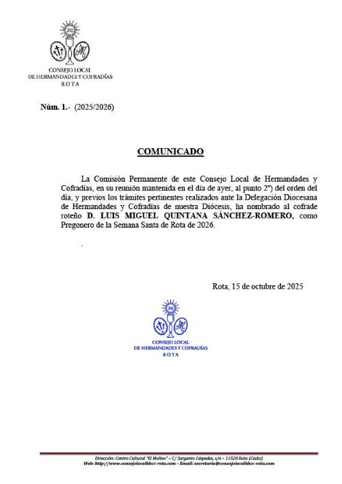 ROTA COFRADE.- El Consejo Local de Hermandades y Cofradías ha anunciado que Luis Miguel Quintana Sánchez-Romero será el encargado de pronunciar el LXI Pregón de la Semana Santa de Rota, tras reunión mantenida el pasado 14 de octubre, al punto segundo del orden del día y tras la aprobación ante la Delegación Diocesana de Hermandades y Cofradías de la Diócesis Asidonense-Jerezana.