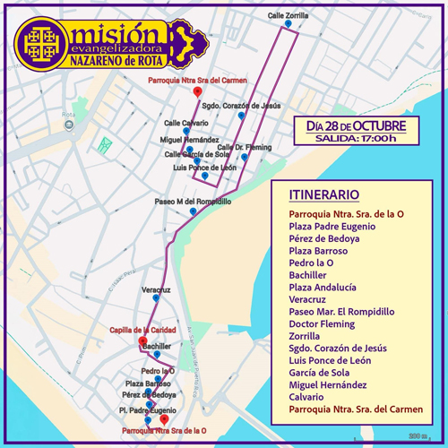 La Misión comenzará el martes, 28 de octubre, a las 17:00 horas, cuando comenzará el traslado del Nazareno desde la Parroquia de Ntra. Sra. de la O hasta la Parroquia de Ntra. Sra. del Carmen. Celebrándose una solemne Eucaristía a las 20:00 horas.