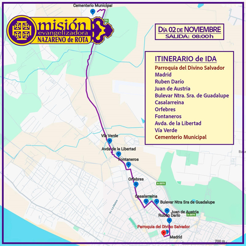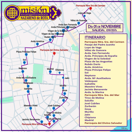 Itinerario: Parroquia de Ntra. Sra. del Carmen, Pasaje del Padre Juanito, Lope de Vega, Vélez de Guevara, Avenida de San Fernando, Avenida Príncipes de España, Virgen de la Soledad, Plaza de las Angustias, Rubén Darío, Avenida América, Plaza Príncipe Felipe, Sol, Neptuno, Avenida María Auxiliadora, Velázquez, Isabelita, Maestro Vives, Jacinto Benavente, Avenida de la Marina, Parroquia de Ntra. Sra. del Mar, Tirso de Molina, Salcillo, José Cubiles, Zurbarán, Goya, Murillo, Jaén, Chipiona, Madrid, llegando a la Parroquia del Divino Salvador.