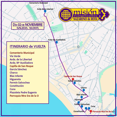 Itinerario: Cementerio Municipal, Vía Verde, Avenida de la Libertad, María Auxiliadora, Capilla de San Roque, García Sánchez, Charco, Blas Infante, Higuereta, Fermín Salvochea, Constitución, Cuna, Plazoleta del Padre Eugenio, Plaza Bartolomé Pérez y llegada a la Parroquia de Ntra. Sra. de la O.