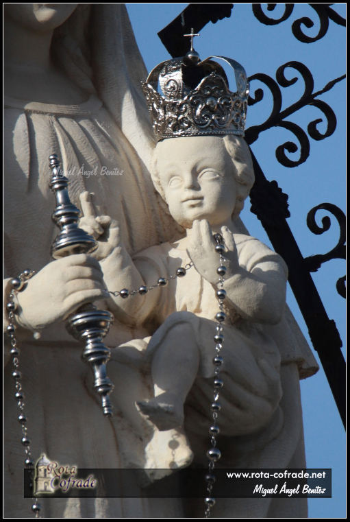 ROTA COFRADE.- La Virgen del Rosario ubicada en la Plaza del Triunfo luce la restauración de la corona, cetro y rosario.