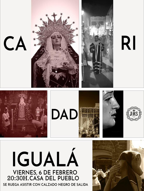 ROTA COFRADE.- La Hermandad de la Salud ha anunciado la celebración de la igualá de la cuadrilla de costaleros del paso de palio de María Stma. de la Caridad para el próximo viernes 6 de febrero, a las 20:30 horas en la Casa del Pueblo (Calle Valle Inclán, 7).