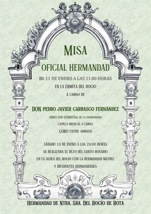 ROTA COFRADE.- El próximo domingo, 11 de enero, a las 11:00 horas se celebrará Misa Oficial de Hermandad de Rota en la ermita del Rocío, que será oficiada por el Rvdo. Sr. D. Pedro Javier Carrasco Fernández (Director espiritual de la Hermandad y Párroco de Ntra. Sra. del Carmen).