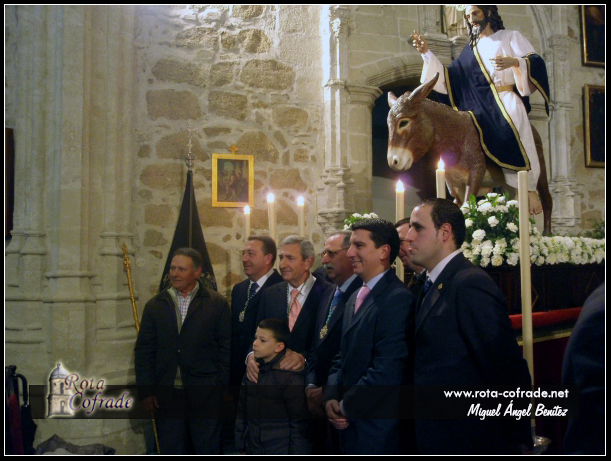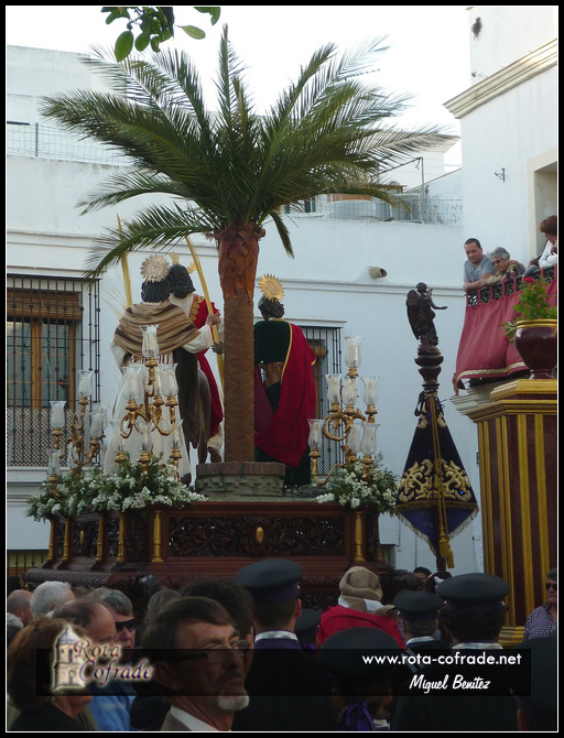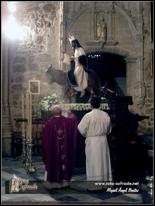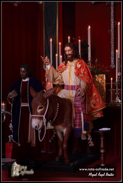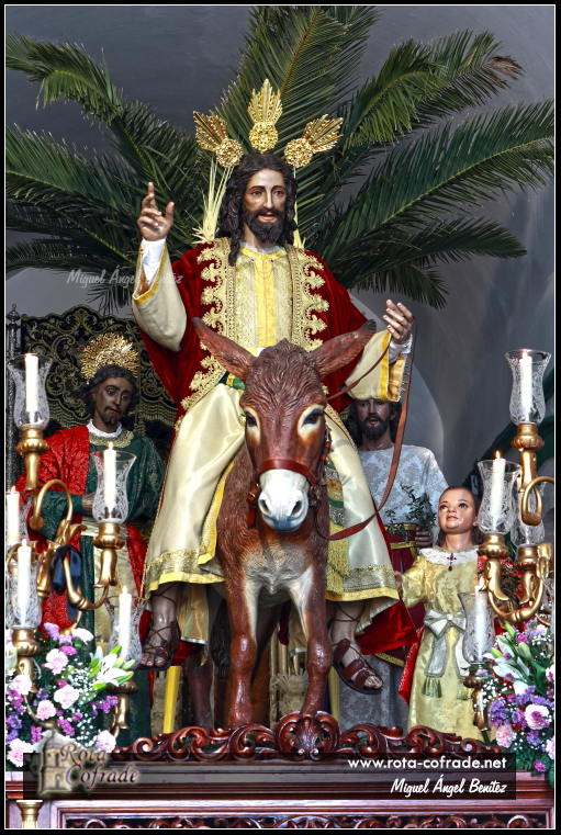 La Capilla Musical estuvo a cargo del Orfeón ‘Virgen de la Escalera’. Por motivos meteorológicos, la imagen no pudo ser trasladada en procesión de alabanza a la Capilla de San Roque, permaneciendo en la nave central de la Parroquia Mayor durante toda la jornada dominical. Las imágenes de Jesús de la Paz y la borriquita están realizadas en madera de cedro policromada. El Señor mide 1,80 metros y es imagen de cuerpo entero, con brazos articulados, destacando la expresión sonriente de Jesucristo. La borriquita, realizada a tamaño natural, está inspirada en una de raza árabe llamada ‘Carmen’ propiedad de Vicente Pate, a la que el escultor realizó un amplio seguimiento para conseguir en la talla la máxima realidad de su anatomía y movimiento.