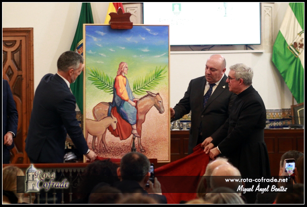 La Entrada Triunfante de Jesucristo en Jerusalén ha presentado una pintura, acrílico sobre lienzo, donde destaca su gran colorido que se aleja del realismo fotográfico. La figura de Jesucristo es el eje central, mostrándose de perfil, con una expresión serena y humilde. Destaca la presencia del pequeño pollino al lado de la burra, una referencia fiel a los Evangelios. Dos palmas cruzadas se muestran tras la figura de Jesús que simbolizan el triunfo y la aclamación del pueblo y se convierte en una especie de aureola que enmarca al Señor. Es un cartel que equilibra la tradición iconográfica con un diseño vanguardista, que rompe con lo esperado de una forma valiente, que transmite la alegría del Domingo de Ramos y la luz de Rota.