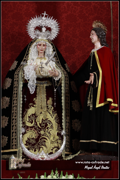 ROTA COFRADE.- María Santísima de la Amargura se encuentra vestida con saya burdeos bordada en oro, manto negro con bordados en oro procedentes de reposteros y pasamaneria antigua dorada. Su tocado está realizado con blonda de antiguo encaje de técnica mixta de duquesa y punto de aguja; el pecherín está realizado con una antigua pieza de raso de seda bordado en hojilla de oro y, en su mano porta pañuelo de encaje de Bruselas, rosario de plata y cuentas de amatistas, rosario de plata y azabache.