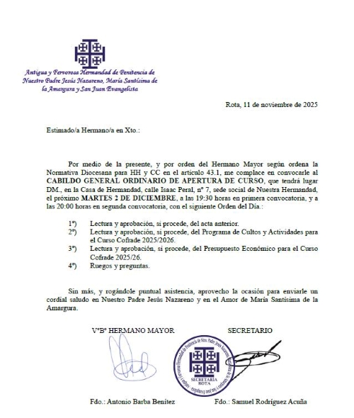 ROTA COFRADE.- La Hermandad del Nazareno celebrará Cabildo General Ordinario de apertura de curso el próximo martes 2 de diciembre en su Casa de Hermandad, a las 19:30 horas en primer convocatoria y a las 20:00 horas en segunda.