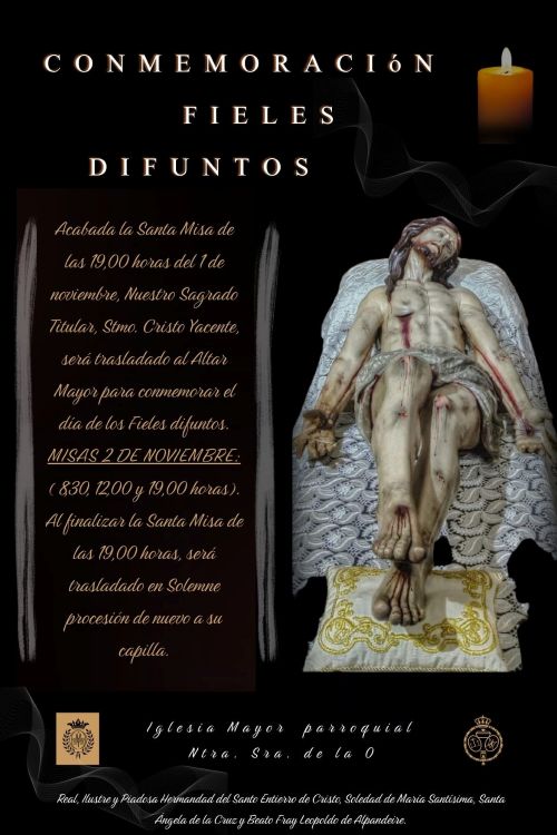Con motivo de este día, el Santísimo Cristo Yacente estará en el altar mayor de la Parroquia de Ntra. Sra. de la O, para conmemorar este día. Siendo el horario de las misas a las 08:30, 12:00 y 19:00 horas.