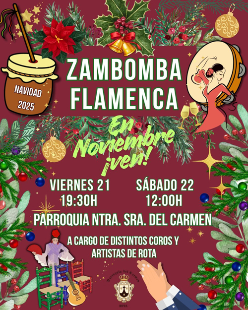 ROTA COFRADE.- El próximo viernes 21 de noviembre a las 19:30 horas, y el sábado 22 de noviembre a las 12:00 horas, tendrá lugar una Zambomba Flamenca organizada por la Parroquia de Ntra. Sra. del Carmen.