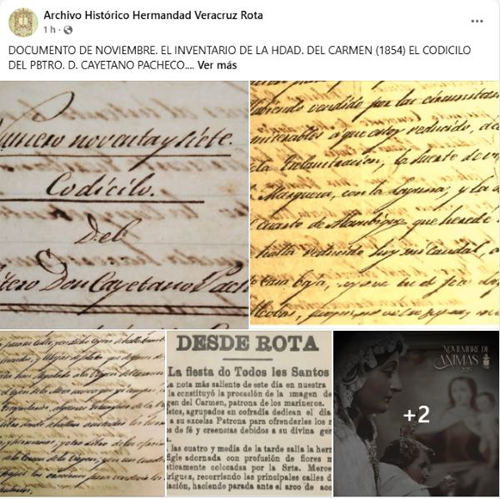 ROTA COFRADE.- El Archivo Histórico de la Hermandad de la Vera-Cruz de Rota ha vuelto a publicar un interesante documento sobre uno de sus hallazgos. En este caso se trata de un codicilo del Presbítero D. Cayetano Pacheco, donde cita un inventario de la Hermandad del Carmen en 1854.