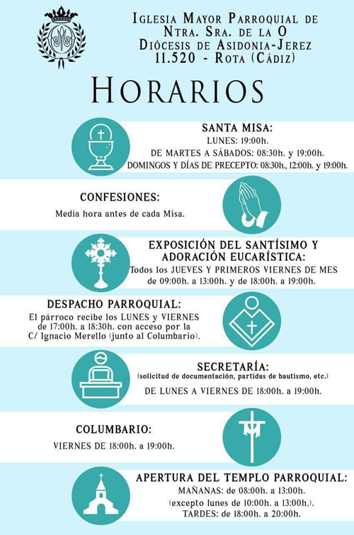 ROTA COFRADE.- La Parroquia de Ntra. Sra. de la O, ha informado de los nuevos horarios en el templo roteño.