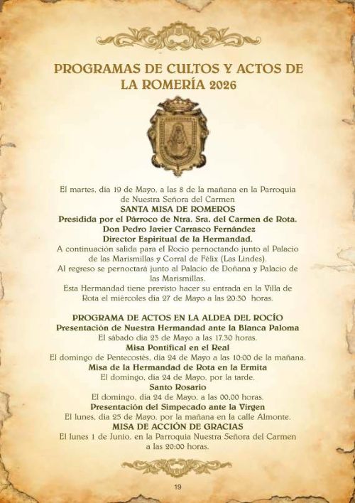ROTA COFRADE.- La Hermandad del Rocío de Rota celebrará Cabildo General Extraordinario de Elecciones el próximo viernes 10 de abril, en la Parroquia de Nuestra Señora del Carmen, a las 20.30 horas, en primera convocatoria y media hora más tarde en segunda convocatoria, con la única candidatura presentada por Rafael Caraballo Márquez.