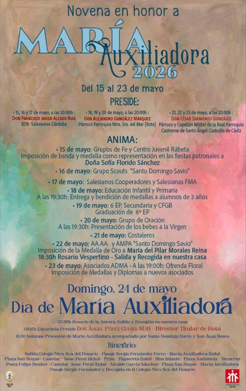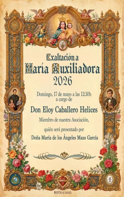 ROTA COFRADE.- El viernes, 24 de abril, en el Colegio Salesiano Ntra. Sra. del Rosario, a las 20:00 horas, la Asociación de María Auxiliadora de Rota celebrará una Eucaristía de Conmemoración de María Auxiliadora.