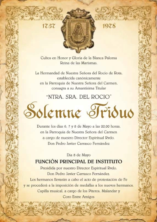 ROTA COFRADE.- La Hermandad de San Isidro Labrador celebró el Solemne Triduo durante los días 14, 15 y 16 de abril, en la Parroquia de Ntra. Sra. de la O, a las 20:00 horas, con homilía a cargo del Rvdo. Sr. D. Santiago Gassín Ordóñez (Párroco de Ntra. Sra. de la O y director espiritual de la Hermandad).