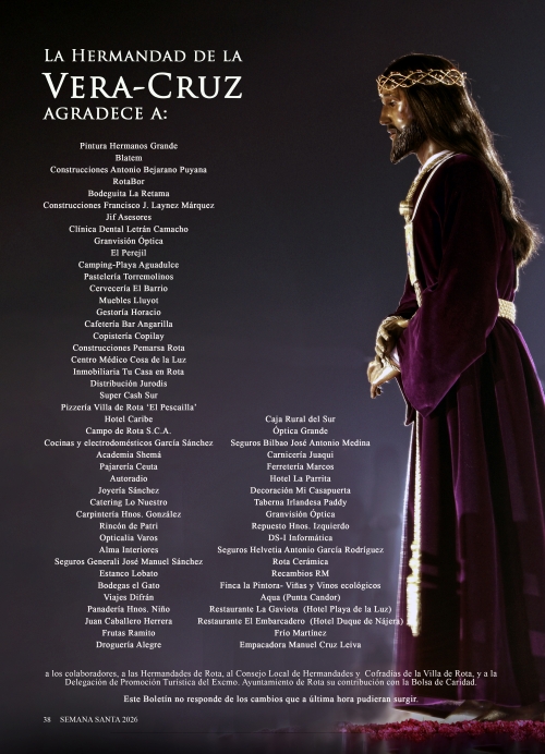Juntamente con la revista pueden encontrar un tríptico con los horarios e itinerarios de la Semana Santa de Rota 2026, editado por la Hermandad de la Vera-Cruz con el azulejo conmemorativo de los 400 años de la fundación de la Cofradía de la Soledad. Estos horarios e itinerarios han sido editados gracias al patrocinio de la Clínica Dental Letrán Camacho y la colaboración del Consejo Local de Hermandades y Cofradías de la Villa de Rota.