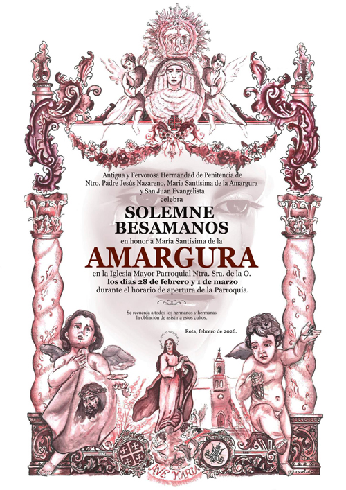 ROTA COFRADE.- El próximo sábado 28 de febrero y el domingo 1 de marzo, la Imagen de María Santísima de la Amargura estará en ceremonia de besamanos, en horario de apertura del templo parroquial de Ntra. Sra. de la O.