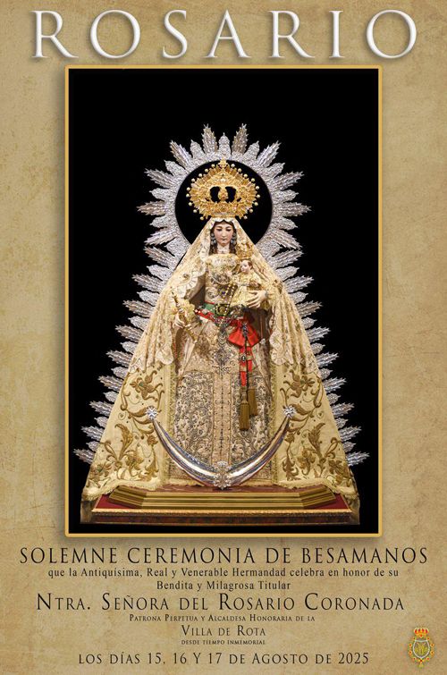 ROTA COFRADE.- Durante los próximos días 15, 16 y 17 de agosto, tendrá lugar la solemne ceremonia de besamanos en honor a Nuestra Señora del Rosario Coronada.