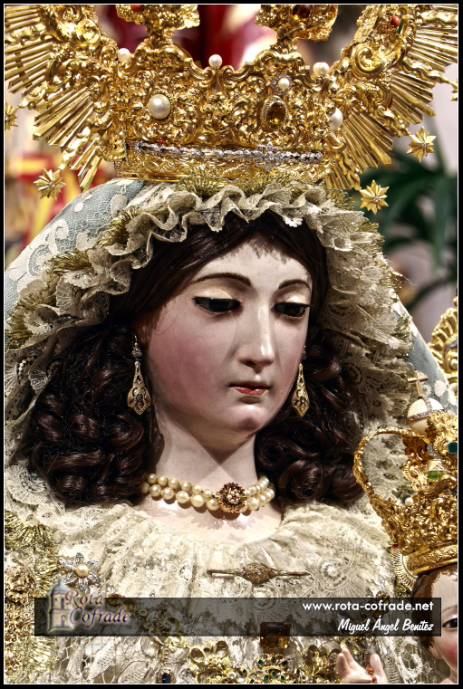 La Santísima Virgen se encontraba vestida con la saya de tisú bordada en oro y aplicación, con cinturilla de seda y pasamanería en plata. En su pecho, lucía encaje de plata y seda de Lyon y blonda de punto de aguja del siglo XIX, además de lucir manto de tisú celeste bordado en oro y mantilla española. Estrenaba pendientes y alfiler de oro donados por Rafael Palomeque Rodríguez.