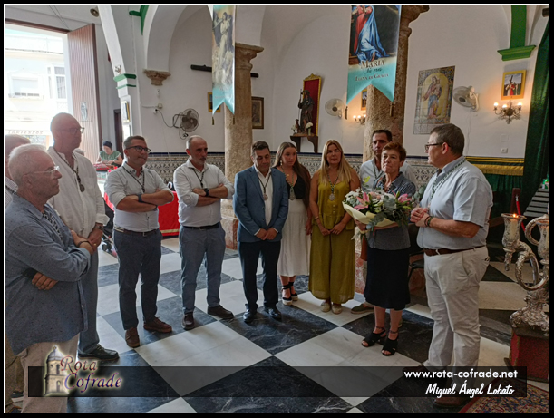 ROTA COFRADE.- El pasado 15 de agosto (Solemnidad de la Asunción de María), con motivo del solemne besamanos que tuvo lugar en la Capilla de San Roque, la Hermandad de la Salud realizó visita institucional a la Hermandad del Viernes Santo roteño para hacerle entrega de un ramo de flores para la imagen dolorosa de María Stma. de las Angustias.