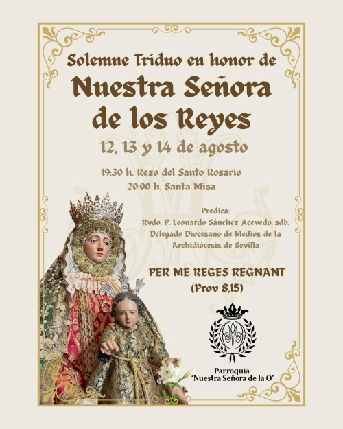 ROTA COFRADE.- La Parroquia de Ntra. Sra. de la O celebrará un solemne triduo en honor a Nuestra Señora de los Reyes durante los días 12, 13 y 14 de agosto. Los cultos comenzarán a las 19:30 horas con el rezo del Santo Rosario y Santa Misa a las 20:00 horas.