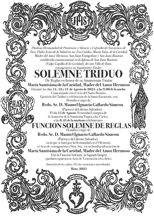 ROTA COFRADE.- La Hermandad de la Salud celebrará Solemne Triduo de Reglas en honor de su Amantísima Titular, María Santísima de la Caridad, Madre del Amor Hermoso, durante los días 11, 12 y 13 de agosto, a las 21:00 horas, comenzando con el rezo del Santo Rosario, ejercicio del triduo y celebración de la Santa Eucaristía, con homilía a cargo del Rvdo. Sr. D. Manuel Ignacio Gallardo Simeón (Párroco de la Iglesia del Divino Salvador).