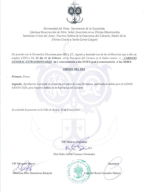 ROTA COFRADE.- Este próximo miércoles 11 de enero, a las 19:30 horas (en primera convocatoria) y a las 20:00 horas en segunda convocatoria, la Hermandad del Amor celebrará cabildo general extraordinario, en la Parroquia del Carmen, cuyo punto será la aprobación, si procede, de la donación de una parihuela de salida para el Lunes Santo de 2026 para Ntra. Sra. de la Esperanza, por parte de unos hermanos.