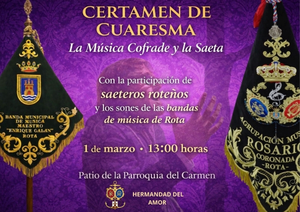 ROTA COFRADE.- El próximo domingo, 1 de marzo, a las 13:00 horas en el patio de la Parroquia de Ntra. Sra. del Carmen, la Hermandad del Amor organizará un Certamen de Cuaresma de música cofrade y saetas.