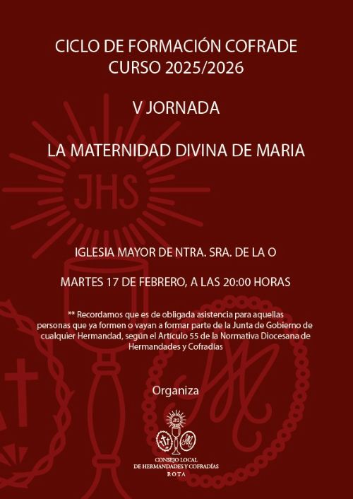 ROTA COFRADE.- El próximo martes, 17 de febrero, a las 20:00 horas en la Iglesia Mayor de Ntra. Sra. de la O, se celebrará la V Jornada del ciclo de formación cofrade titulada 'La Maternidad Divina de María'.