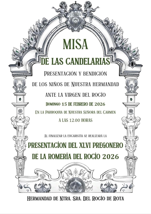 ROTA COFRADE.- El próximo domingo 15 de febrero, a las 12:00 horas, en la Parroquia de Ntra. Sra. del Carmen, la Hermandad del Rocío celebrará la Misa de la Candelaria donde se hará la presentación y bendición de los niños de la Hermandad ante su Imagen Titular.