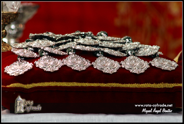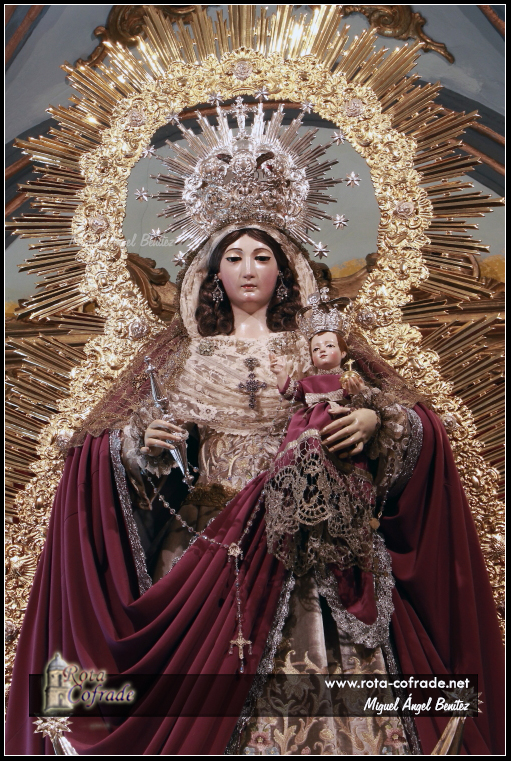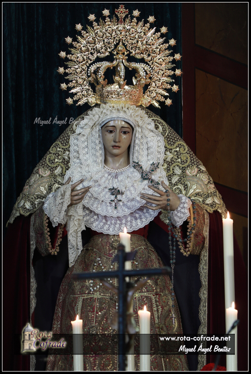 ROTA COFRADE.- La Virgen del Rosario está vestida para la Cuaresma con saya de terciopelo bordado gris plata, tocado de encaje de Bruselas, manto de satén morado cardenal y toca de sobremanto de encaje francés de oro.
