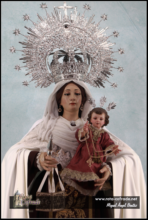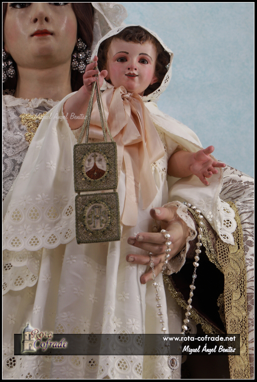 El Niño Jesús viste batón de bautismo, portando escapulario, recordándonos su promesa de auxilio y salvación a quienes lo visten con devoción, mientras que en la mano derecha de la Virgen, a parte de su tradicional escapulario, se dispone una vela, sustituyendo al tradicional cetro, como símbolo de la luz que centra esta festividad, conocida popularmente como la Candelaria o Fiesta de las Candelas.