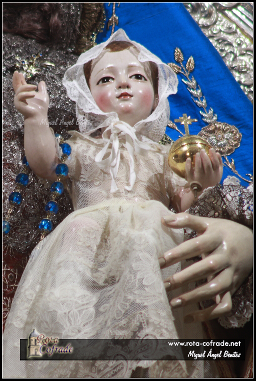Además, porta cetro y corona de plata y ráfaga dorada. El Niño Jesús viste traje de satén morado cardenal enriquecido con pasamanería de plata y encaje de bolillos de hilo de plata.