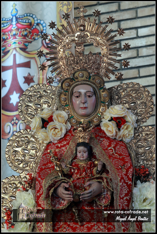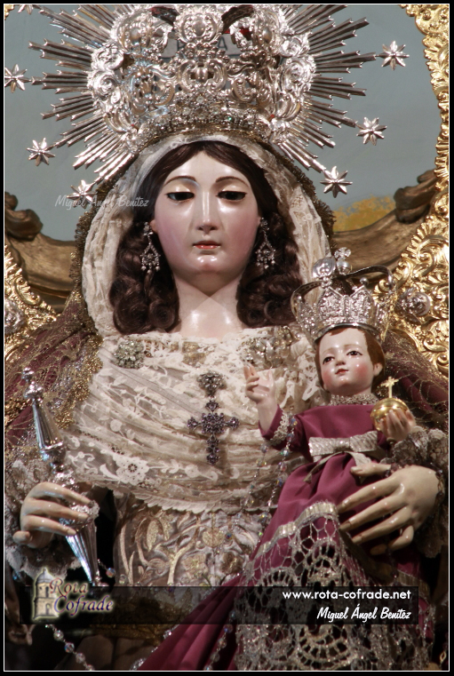 La Santísima Virgen luce saya brocada en tono marrones y dorado, combinada con manto beige florales, realizado sobre el año 1940 y recuperado tras su mal estado, portando su corona de plata, realzando así la solemnidad de esta celebración litúrgica.