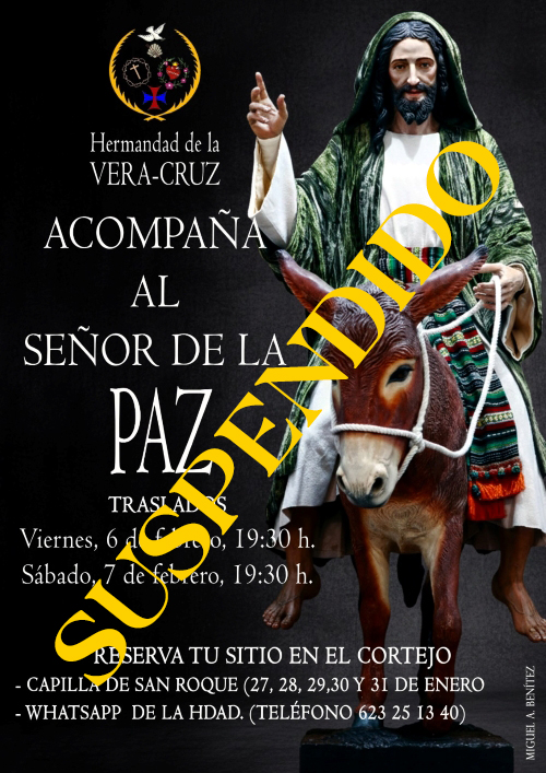 ROTA COFRADE.- La Junta de Gobierno de la Hermandad de la Vera-Cruz, reunida en cabildo extraordinario de oficiales, ha aprobado la suspensión de los traslados de Ntro. Padre Jesús de la Paz previstos para mañana viernes 6 y el sábado 7, debido a las condiciones meteorológicas adversas.